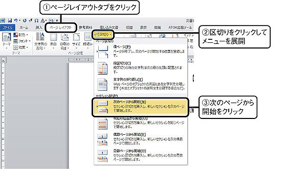 書籍(技術書に限らない)や学位論文では,章が変わると新たなページから始める.詳しくは第11章で説明するが,章の終わりにセクション区切りを入れておくと,ヘッダーおよびフッターデザインの柔軟性が増す.セクション区切りはページレイアウトタブの区切りをクリックしてメニューを展開し,セクション区切りの次のページから開始をクリックすることで挿入できる.ヘッダーおよびフッターのデザインについては,第11章にまとめている.