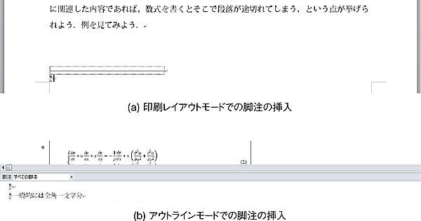 脚注も参考資料タブから入力できるので,簡単に触れておこう.参考資料タブの脚注の挿入ボタンをクリックすれば,カーソルが置かれていた位置に脚注番号が挿入され,脚注にカーソルが移動する.印刷レイアウトモードであればページの下部(設定によっては文書の最後),アウトラインモードであれば,脚注用のフレームが現れる.