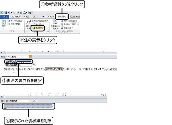 まず,印刷レイアウトモードで作業している場合は,アウトラインモードに移行する.参考資料タブの注の表示をクリックすると,脚注用のフレームが現れる.当該フレーム上部にある,脚注と名付けられたプルダウンメニューを展開し,脚注の境界線をクリックする.境界線が表示されるので,その線を消去すれば印刷レイアウトモードに切り替えたときに線が消えていることが確認できる.