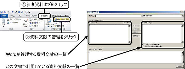 Wordはそれ単体で文献を管理する簡易的なデータベースと文献引用の機能を有している.そのデータベースへの文献の登録と,登録された文献の引用方法について述べる.