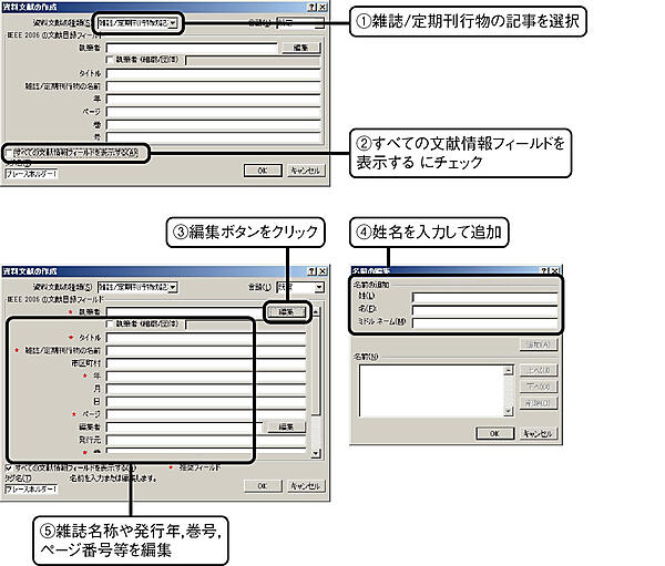 最も多いと思われる学会論文の情報を入力するには項目が足りないが,これは表示されていないだけである.すべての文献情報フィールドを表示するにチェックを付けるとWordが管理する全ての情報が入力できるようになるので,必要な項目を記入する.このとき,言語が既定になっているが,この項目は明確に日本語か英語かを分類しておいた方がよい.著者名を記入するには,著者フィールドの右にある編集ボタンを押して複数人の情報を追加する.このようにして登録した資料文献情報は,現在のリストとマスターリストの双方に登録される.既にマスターリストに登録してある情報を利用したい場合は,マスターリストから当該文献を選択し,現在のリストにコピーする.