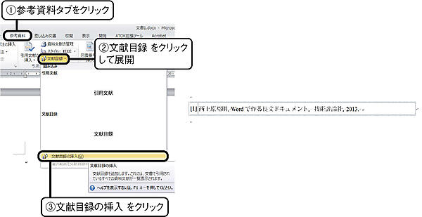 一通り文章を書き上げた後,文書末尾に引用文献の一覧を挿入する.文献一覧を挿入するには,参考資料タブの文献目録をクリックし,文献目録の挿入を選ぶ.組み込みとして引用文献や文献目録という題目付きの目録形式が用意されているが,著者らの分野では,題目を参考文献や単純に文献とすることが多いので,Wordに組み込まれている書式では対応できない.そのため,文献目録として文献の一覧のみを挿入し,そういった題目は見出しスタイルで付けることにする.
