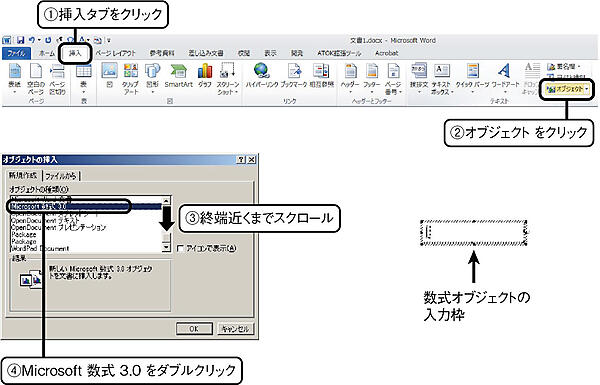 数式エディタを利用して数式を入力するには,挿入タブのオブジェクトをクリック1してオブジェクトの挿入ダイアログを出し,オブジェクトの種類をスクロールしてMicrosoft数式 3.0をクリックする.オブジェクトを挿入すると,Wordのメニューバーが数式エディタのメニューに変化する.