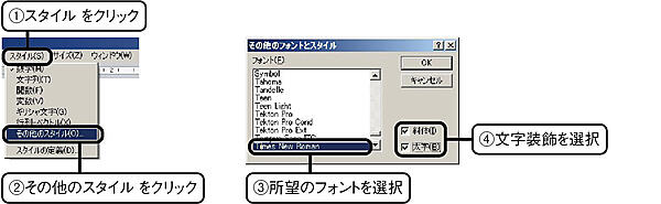 数式を整形するためにスペースを使う場合には,スタイルを数式から文字列に変更する必要がある.これを忘れてスペースが入らなかったり,文字列から数式に変更するのを忘れて斜体が入力されなかったりと,色々と手を焼かせてくれる.スタイルには,文字列以外にも関数や行列等がある.気に入らなければ,その他のスタイルからその他のフォントとスタイルダイアログを出し,所望のフォントを利用すればよい.斜体や太字も容易に利用できる.