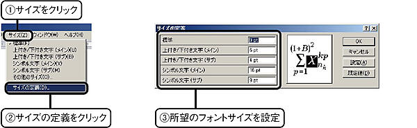 数式エディタのフォントサイズは,数式エディタが起動した状態でメニューバーのサイズ→サイズの定義から変更する.標準のサイズから2~3 pt小さくするとよい.2 pt下げると添え字が小さすぎると感じる読者は,1 ptだけ小さくすればよい.なお,このフォントサイズは全ての数式オブジェクトに共通の値であるため,文書ごとに異なる数式フォントサイズを利用していると,過去に作成した文書内の数式を編集する際にフォントサイズが変わり,数式オブジェクトの大きさ自体が変化してしまう場合がある.