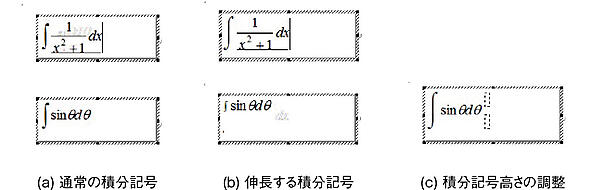 数式エディタで入力する積分記号は,数式の高さに応じてその高さが変化しない.高さで変化する積分記号を入力するには,Shiftキーを押しながらツールバーの積分記号を選択する.数式に分数などが含まれていれば積分記号の幅が変化するが,1行だけだと変化しない.強引に積分記号を伸ばすために,数式の最後に2行1列の行列テンプレートを置く.このとき,積分記号と共に現れる入力枠の外に置いてしまうと積分記号が変化しない.