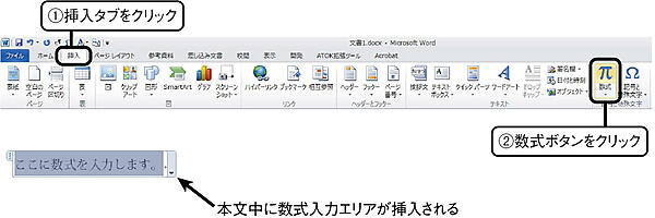 数式は,Word 2007から追加された数式入力環境である.この機能を利用するには,挿入タブの数式ボタンをクリック6するか,ショートカットキーAlt + =(日本語キーボードの場合はAlt + Shift + -)を利用して数式のコンテンツコントロール(数式を入力するエリア)を挿入する.