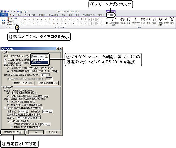 3.6節で数式用のフォントをダウンロードしたが,ここでようやく設定をしよう.設定を先送りしたのは,数式を入力しないと数式のフォントを設定するタブが現れないからである.入力した数式をクリックすると,タブに数式ツール デザインと書かれたタブが現れる.そのタブをクリックし,数式オプションダイアログを表示する.数式エリアの既定のフォントがCambria Mathになっている.XITS Mathフォントがインストールできていれば,プルダウンメニューを表示するとXITS Mathが現れる.現れなければ再度フォントのインストールを試みて欲しい.XITS Mathをクリックし,規定値として設定することで,数式の既定のフォントを変更できる.