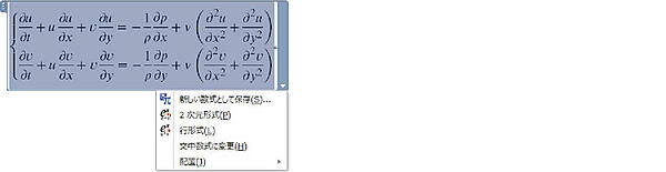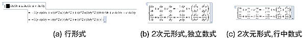数式には,数式を組み立てない行形式と,数式を組み立てた2次元形式の2種類がある.2次元形式と行形式は,数式を右クリックした際に出てくるメニューから切り替えられるが,行形式を使用する状況は想像できない.また,2次元形式には独立数式と文中数式という二つの形式がある.新しい段落で数式を作成すると独立数式になり,数式の前後に何か文字を入力すると,自動で文中数式に変換されてしまう8.これを抑制する方法は無く,論文で数式を入力し,式番号を付けようとタブなり括弧なりを入力した瞬間に行形式に変形されてしまう.回避策としては,1行3列の表を設け,左のセルで数式インデントを調整し,中央セルに数式,右のセルに数式番号を置く方法がある.これとは異なる回避策については,8.5節で紹介する.