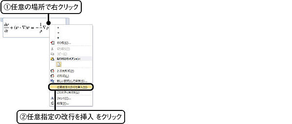 数式が文書の幅より長くなった場合,数式は自動で複数行に折りたたまれる.読者自身の手で改行することもできる.数式中の改行したい位置を右クリックし,出てきたメニューから改行を選択すればよい.