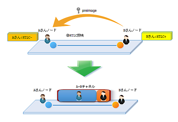 Aさんは、受信したpreimageが正しいと判断すればHTLCのBitcoin量を反映します。