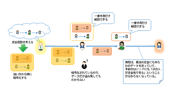 経路情報は送金経路のLNノードを中継して渡していくことになりますが、途中のLNノードに情報を見られたり、改ざんされたりしないように、送金元の人が暗号化します。そして、経路情報を中継するLNノードは自分が次のLNノードに送金するための情報だけを解読できる仕組みになっています。