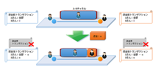 もしAさんが最新ではない配分のトランザクションをブロックチェーンに展開すると、Bさんがチャネルの全額を受け取れるように作られています。悪いことをすると、損をするのです。