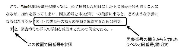 我々はかしこいので,ラベル,図番号,キャプションを正しく認識できる.しかし,Wordは特にラベルに対する認識が異なり,どうやら図表番号の左にある内容をラベルとして認識するようである.また,図表番号の直後から始まり,段落が終わるまでの全ての内容をキャプションと認識する.これは図 68および図 69に示した例文からの推察である.この例文は,図表番号が独立した段落になく,他の文章と同一の段落にきてしまった場合に,その図表番号を相互参照するとどのようになるのかを示している.