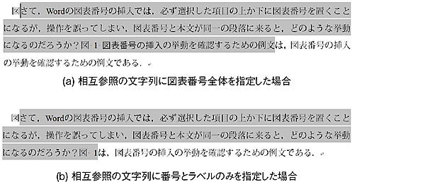 相互参照の文字列に図表番号全体を選択すると,段落冒頭の「さて」から改行記号直前の「例文」までが参照されている(図 69(a)).相互参照の文字列を番号とラベルのみに変更すると,段落冒頭の“さて”から始まるのは同じであるが,図 1までしか参照されていないことが確認できる(図 69(b)).