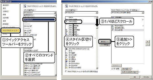 スタイル区切りは標準ではリボンに搭載されていないので,見かけた事がある読者は多くないかも知れない.クイックアクセスツールバーに登録する方法を示しておこう.3.5節を参考にクイックアクセスツールバーのオプションを表示し,コマンドのプルダウンメニューから全てのコマンドを選択し,スタイル区切りを探してクリックし,追加する.リボンのユーザ設定でもほぼ同様にして個人用タブに追加できる.ショートカットキーはAlt+Ctrl+Enterである.