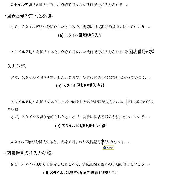 図 71はスタイル区切り挿入時のWordの挙動である.スタイル区切りを挿入すると,点線で囲まれた改行記号が入力される.そして,おそらくその段落あるいは前後の段落のスタイルが崩れるだろう.著者らの経験によると,スタイル区切りを入力すると,ほぼ確実にスタイルが崩れる.また,所望の場所にスタイル区切りが入力されない.まずは落ち着いてこれは正しい挙動だと自身に言い聞かせ,スタイル区切り記号のみを選択して切り取り,Ctrl+Zを2回入力する2.その後,スタイル区切り記号を正しい(所望の)位置に貼り付ける.これ以降,スタイル区切りを挿入したい場合には,入力済みのスタイル区切り記号をコピー&ペーストすればよい.