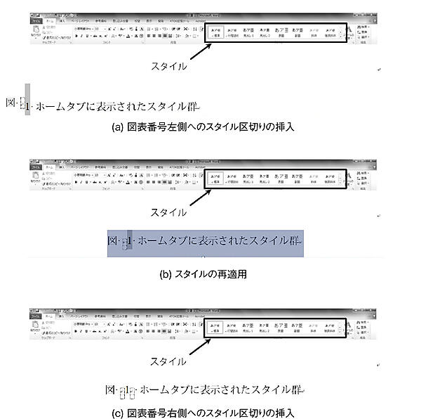 図表番号を挿入してキャプションを記述するところまでは全く同じである.キャプションの記入が終了したら,カーソルを図表番号の左に移動させ,スタイル区切りを入力する.図表番号用のスタイルが崩れ,左に寄ってしまったが,慌てずスタイルを適用し直してほしい.図表番号の右にもスタイル区切りを挿入する.このとき,スタイル区切りの編集記号はコピー&ペーストした方がよい.一見すると隙間が広く空いたように見えるが,スタイル区切りは印刷時には表示されず,隙間は詰められる.