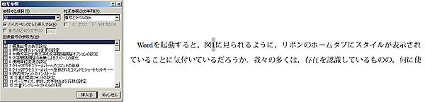 文献番号を引用する場合は,本文中の必要な箇所にカーソルを置き,参考資料タブの相互参照ダイアログから当該ラベルを選択し,入力していく.このとき,番号の左には特殊文字として改行なしを入力する.このようにすると,本文中で新たに文献を引用すると,自動で文献番号が振り直され,文献一覧の番号も更新される.