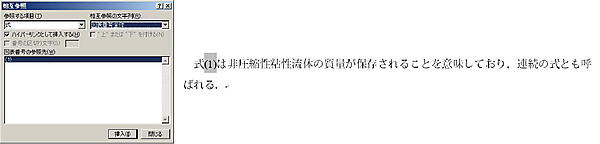 これで入力は完了したので実際に参照してみよう.相互参照の参照する項目から当該ラベルを選択すると,参照先に括弧付きの番号が表示されている.図表番号全体を引用すれば,晴れて数式番号が括弧付きで参照されるようになる.番号とラベルのみを選ぶと,相変わらず終わり括弧が入力されないが,今の我々にとってそのような挙動は恐れるに足りない.