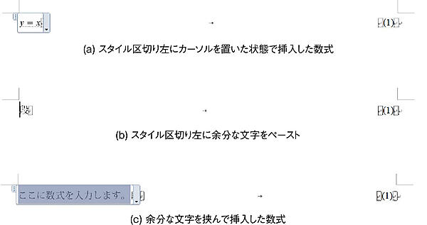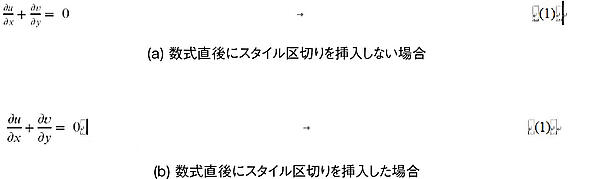 段落の体裁が整ったら,数式,スタイル区切り,数式番号を挿入する.このとき,数式の挿入は最後に行うのであるが,スタイル区切りのすぐ左にカーソルが存在している状態で数式を挿入すると,数式入力の際に数式下に点線が引かれる.この状態になると,数式が印刷時に表示されなくなってしまう.これを回避するには,スタイル区切り記号の左に何らかの文字をコピー&ペーストし,さらにその左に数式を挿入した後,当該文字を削除する.