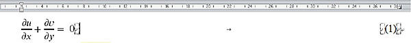 実際にそうなるのかをやってみよう.式を書き,タブなどで適切な隙間を空け,右に揃うように数式番号を図表番号の挿入から挿入する.このとき,ラベルは除外しておく.左括弧の左にカーソルを移動し,スタイル区切りを入力する.同様に右括弧の右にカーソルを移動してスタイル区切りを入力する(図 75).このとき,適切な場所に入力されなければ,カット&ペーストを活用する.段落のスタイルが崩れた場合は,落ち着いてスタイルを適用し直してほしい.