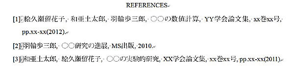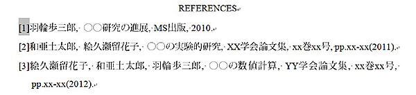 この場合は,やることは図表番号の挿入とほとんど変わらない.文書末に参考文献の章あるいは節を設けたのち,数式番号の挿入と同じやり方で括弧付きの番号を挿入していく.このとき,文献番号を囲む括弧の右にはスタイル区切りが挿入される.その後,番号の後ろに書誌情報を記述していく.このとき,タブやインデントを使って整形する.
