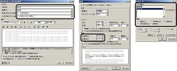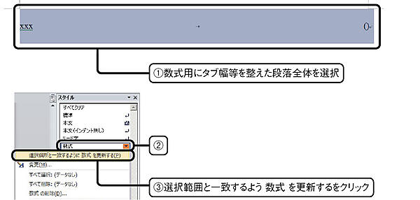 まずは数式用のスタイルを確認しておこう.スタイルで設定しなければならない項目は,インデント幅および数式と数式番号間に置くタブの設定である.これについては,一度適当な段落でインデントやタブの設定をして数式スタイルを作り,段落を選択状態にし,スタイルウィンドウあるいはクイックスタイルにおいて当該スタイルの右クリックメニューからスタイルを選択箇所と一致するように更新する を選ぶと手軽である.