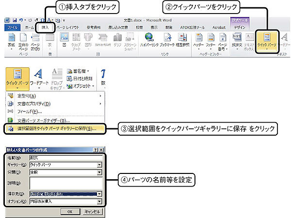 ここまでできたら,段落全体を選択状態にし,挿入タブのクイックパーツから,選択範囲をクイックパーツギャラリーに保存する をクリックする.このとき,定型句の名前などを登録する.分類は全般になっているが,プルダウンメニューから新しい分類の作成を選択すれば,任意の分類名で登録できる.これはクイックパーツに表示されるときにまとまって表示されるかどうかの違いでしかない.保存先は標準でBuilding Blocks.dotxとなっている.これは定型句を登録して配布するために設けられているファイルである.