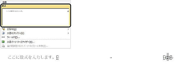 他の計算機環境でも同じ定型句を使いたい場合には,このファイルを当該計算機環境にコピーすればよい.文書テンプレート自体に登録することもできる.テンプレート自体を配布する場合には,文書テンプレートに登録した方がよいだろう.オプションについては,今回の状況では内容のみ挿入でも内容を段落のまま挿入のどちらでもかまわない.一度クイックパーツに登録しておけば,登録されたパーツの一覧から,数式入力用の体裁を数式番号が付与された状態で挿入できるようになる.