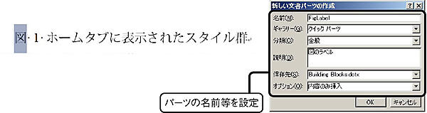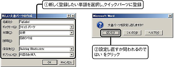 クイックパーツ6とは,定型句の入力の簡略化を図る機能である.入力の方法によっては,定型句として入力した項目を一括で変更できるようになる.この機能を利用し,数式入力時の段落書式設定の簡略化,および図表ラベル変更の簡略化について説明する.