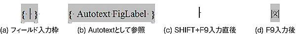図表ラベルについても,同様にクイックパーツに登録する.このとき,登録する名前はアルファベットでなるべく短く,わかりやすくしておく.ここではFigLabelと名付けた.入力する場合は,クイックパーツからではなく,Wordのフィールドとして入力する.ラベルを入力したい箇所で日本語入力を無効にしてCtrl+F9を押すと,フィールドを入力する枠が挿入される.定型句はAutotextと呼ばれるパーツに属しているので,中括弧の中にAutotextパーツ名を入力する.このとき,パーツ名には先ほど付けたラベル名(FigLabel)を入力する.入力ができたらShift+F9を押してフィールドコードを非表示にする.このとき,一度何も表示されなくなるが,入力していた箇所を選択してF9を押すと登録された文字が展開される.フィールドとして入力したラベルはコピー&ペーストで別の箇所に貼り付けられる.