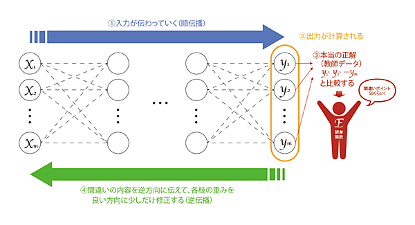 さて、予測を正しく行うためには、逆伝播によりニューラルネットワークが「学習」をしなければなりません(下図③④)。具体的には、