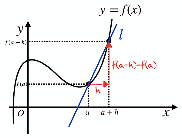 いきなり接線の傾きを求めるのは難しいので、一旦、x=aのところからhだけ離れたx=a+hを考えて、関数上の2点を結んでできる直線lを考えます(下図)。