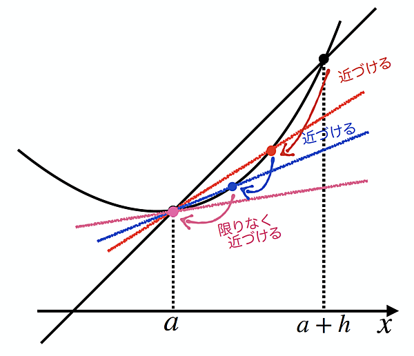 で表せることが分かります。実は、これでx=aにおける接線の傾きまで目の前です。というのも、次図のようにhを0に限りなく近づけると、直線lは限りなく「x=aにおける接線」に近づいて行きますよね。