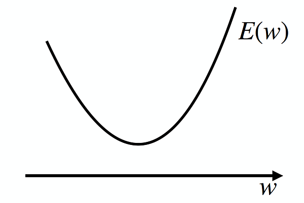 今、関数 E(w) を考えます。この関数の形が、下図のように単純なものだったとしましょう。