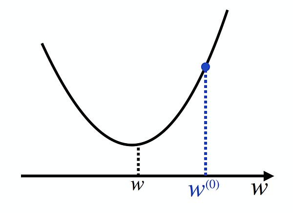 目標は、この関数 E(w) が一番小さくなるようなwを見つけることです。すなわち、下図のwの場所を見つけることです。そのために、まずは適当なwの初期値w(0)を設定しましょう(右肩の(0)は「更新回数0回目」であることを意味しています)。