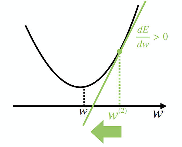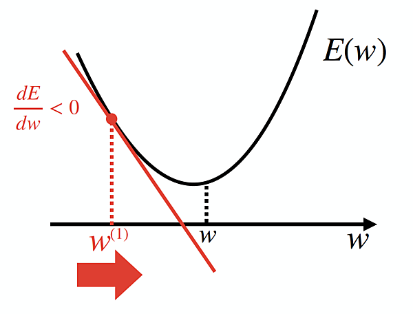 接線の傾き>0 ということは、関数の形を参考にすれば、wをw0より負の方向に動かせば良いことがわかります。すなわち、wを $\frac{ dE }{ dw }$ の逆方向に動かすことを繰り返せば良さそうだ!ということが分かるのです。よって更新後のw(1)は、なんとなくw(1) ← w(0) ー $\frac{ dE }{ dw }$と計算するのが良さそうです。