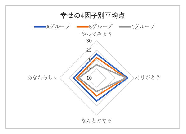 同調査では、アンケートに回答したフリーランス女性を、人生満足度の高さによって3つのグループに分けています。そして、グループごとに「幸せの4因子(表)」の平均点を算出。その結果をチャートで示したものが図2です。