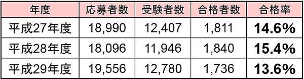 過去3年間の受験者数と合格者数を図3に示します。受験者数は1万2000人弱で、合格率はおおむね14%程度で推移しています。