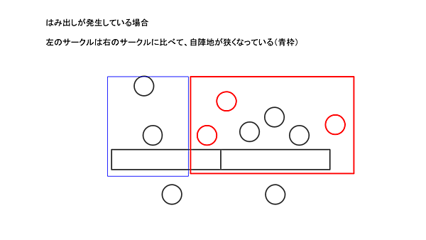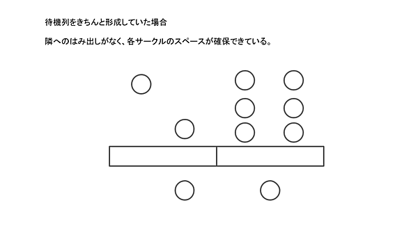 このルールはコミックマーケットに限らず、どの即売会でも一緒です。技術系を取り扱うサークル・それを求める参加者は、この辺りのルール遵守意識が弱い傾向があります。サークルスペース前の空間の奪い合いは、サークルの売り上げに直結する部分です。トラブルに一番なりやすいので、はみ出しには細心の注意を払いましょう。とにかくはみ出さない!これが重要です。