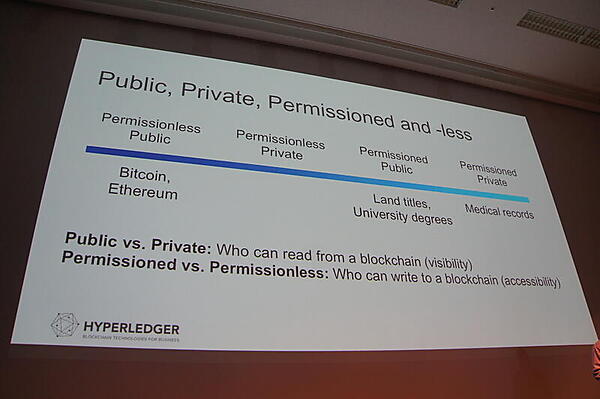 Behlendorf氏はブロックチェーンには幅広い種類があるとして、パブリックかプライベートか、パーミッションドかパーミッションレスかの2つの軸での分類を紹介した。パブリックでパーミッションレスなものになBitcoinやEtheriumが、プライベートでパーミッションドなものには医療記録などがある。