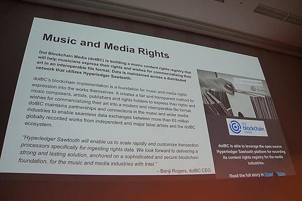 音楽著作権をASCAPやBMI(あるいは日本でいうとJASRAC)のように集中管理するのではなく、ブロックチェーンで分散管理する「dotBlockchain」という取り組みも、Hyperledgerを使っている。