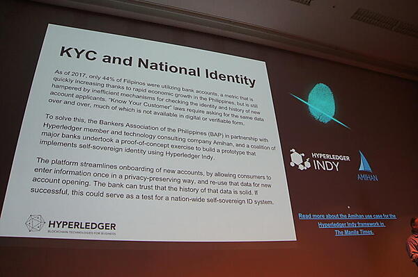 フィリピンでは資金洗浄防止のために銀行口座に身元確認を求めるKYC(Know Your Customer、顧客確認)ルールがある。そこで、フィリピン銀行協会(BAP)とAmihan社では、Blockchain Indyを使ったデジタルなアイデンティティ証明を実験しているという。