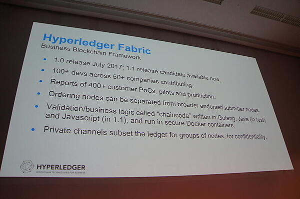 事例に続いて、各プロジェクトをBehlendorf氏は紹介した。まずHyperledger Fabricフレームワークは、2017年7月にバージョン1.0を迎え、現在バージョン1.1がリリースされている。