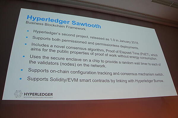 Hyperledger SwatoothはFabricの姉妹プロジェクトのようなものだという。2018年1月にバージョン1.0に到達した。コンセンサスアルゴリズムに大規模でもエネルギー商品の低いPoETアルゴリズムなどを採用している。
