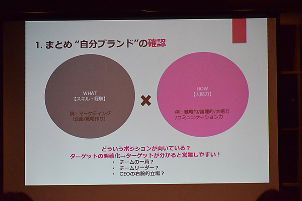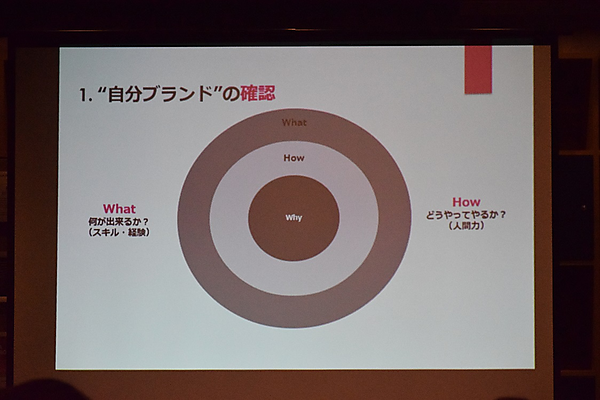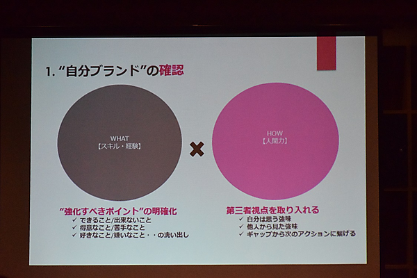では、他者と差別化したブランディングをするためには、どうすれば良いのでしょうか。河合さんは、セルフブランディングするために「WHAT 何ができるか?(スキル・経験)」を明確にし、さらに、それを「How どうやってやるか?(人間力)」を考え、WHATとHOWのかけ算をすることで「自分のブランド」を見つけるという方法を実践しました。
