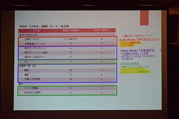 まずは「WHAT(スキル・経験)」の洗い出しです。はじめに、参加者個人が自分のスキル、つまりできることを書き出し、そのスキルを「得意/不得意」と「好き/嫌い」に分けます。そしてグループで「WHAT」を共有します。ここで大切なのが3つの視点。「ライフワーク(生涯かけてやりたいこと)」「ライスワーク(食べるための仕事)」「プロに任せられるもの」に分けること。