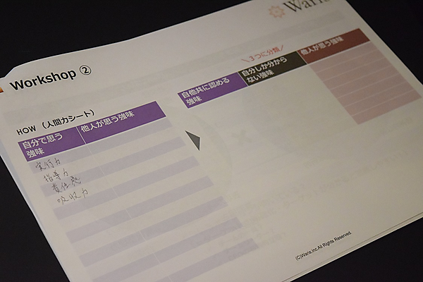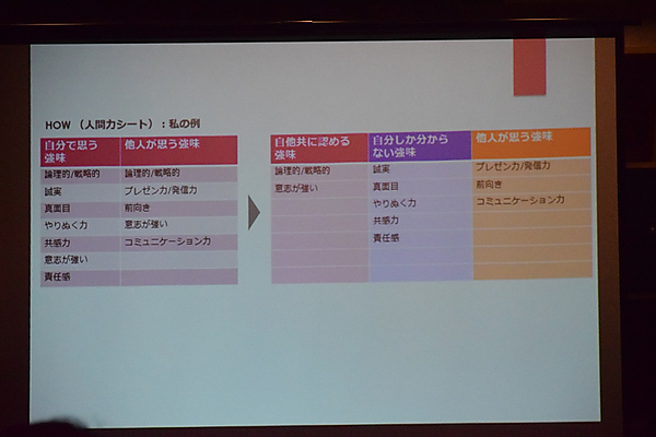 続いて、「HOW(人間力)」の洗い出し。ここで、再び参加者個人が自分の思う強みを書き出し、その強みをグループ内で共有、参加者同士で相手の思う強みを掘り下げて行きます。「自他共に認める強み」「自分しかわからない強み」「他人が思う強み」に分類し、自分が思っている強みと、他人から見える強みのギャップを埋めることで強みが明確になっていくそうです。