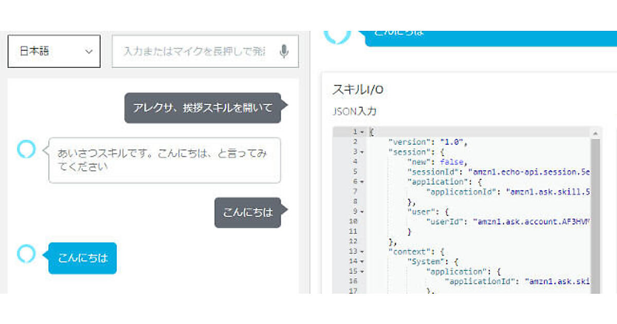 .speak('あいさつスキルです。こんにちは、と言ってみてください')